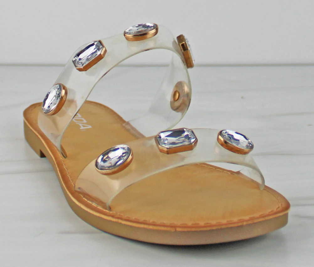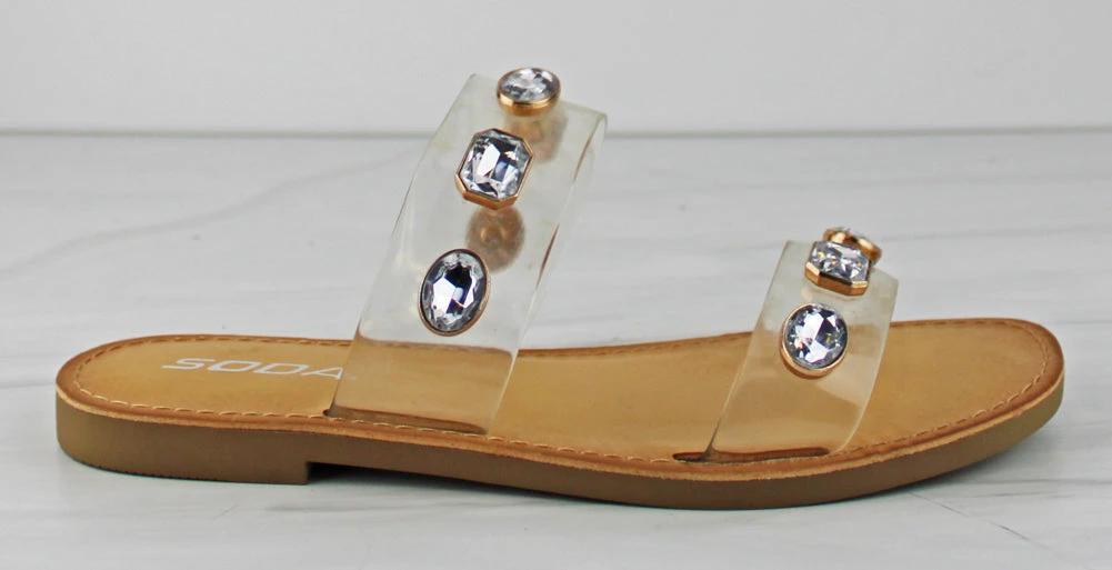Simple yet flashy, these double-banded flat sandals are the perfect addition to your summer wardrobe! With clear straps and silver rhinestones, they will go good with any summer outfit you’ve got!