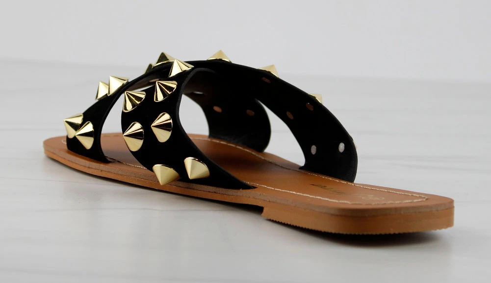 A casual sandal with a little bit of spice! Dorit 68 is a flat slip on sandal that has a crisscross band with spike embellishment!