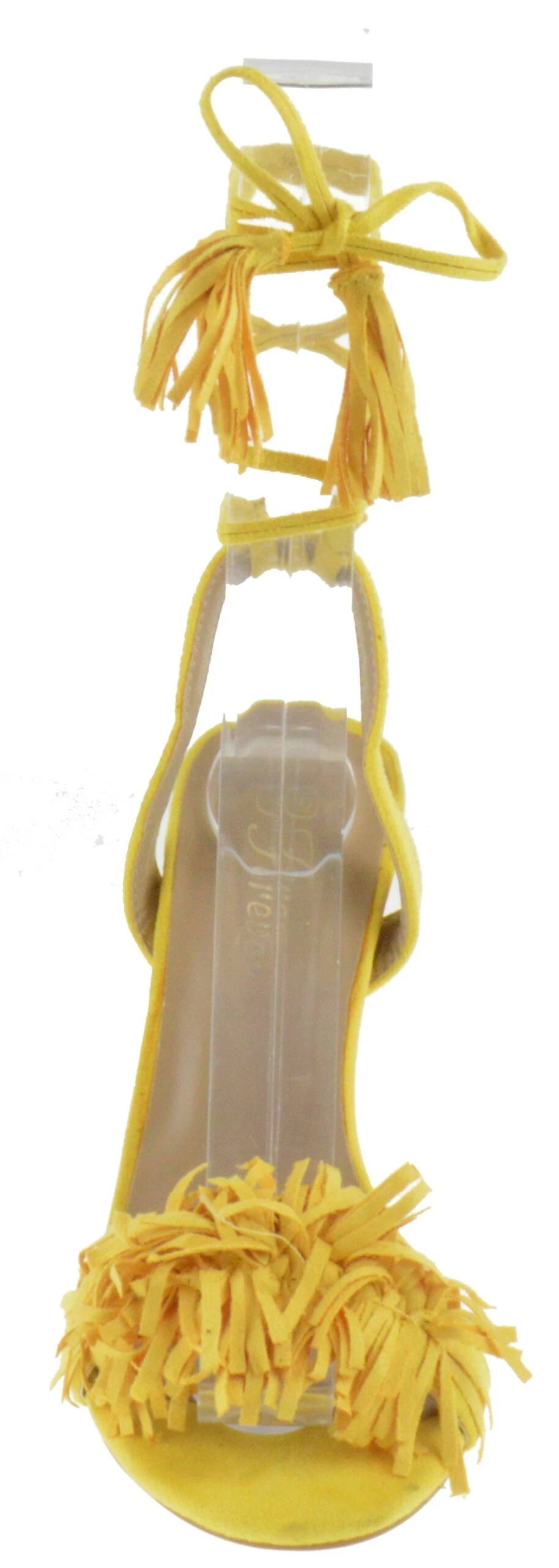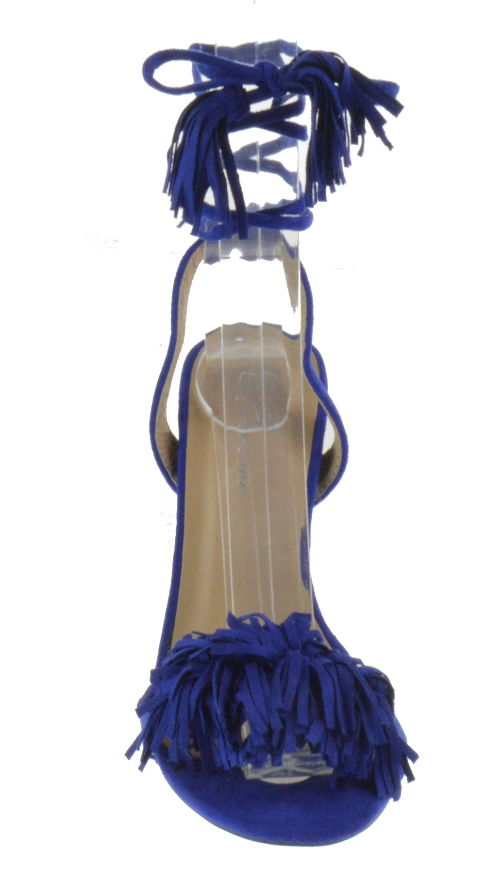 Fringe is in! These eye catching 4′ high stilettos features a 2 tier fringe design with an open toe. Faux suede material that laces up accompanied with tassels.