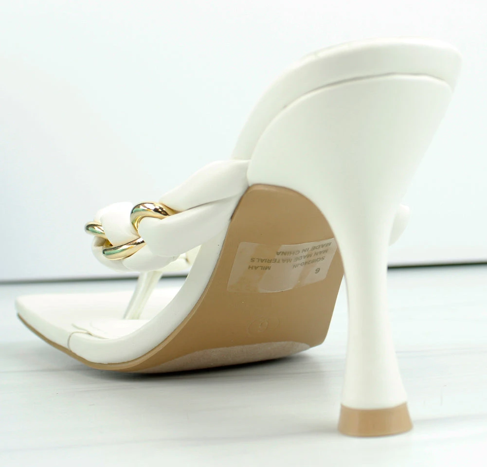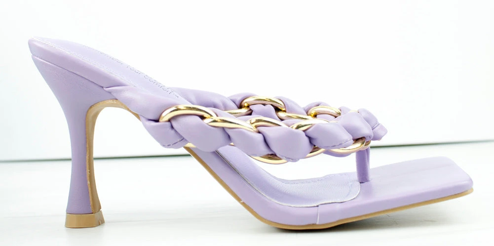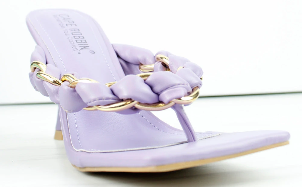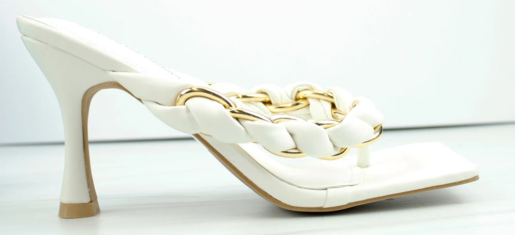These comfortable thong sandals are perfect to dress up! The twisted chain accent draws attention as well as enhances any outfit you wear them with.Â