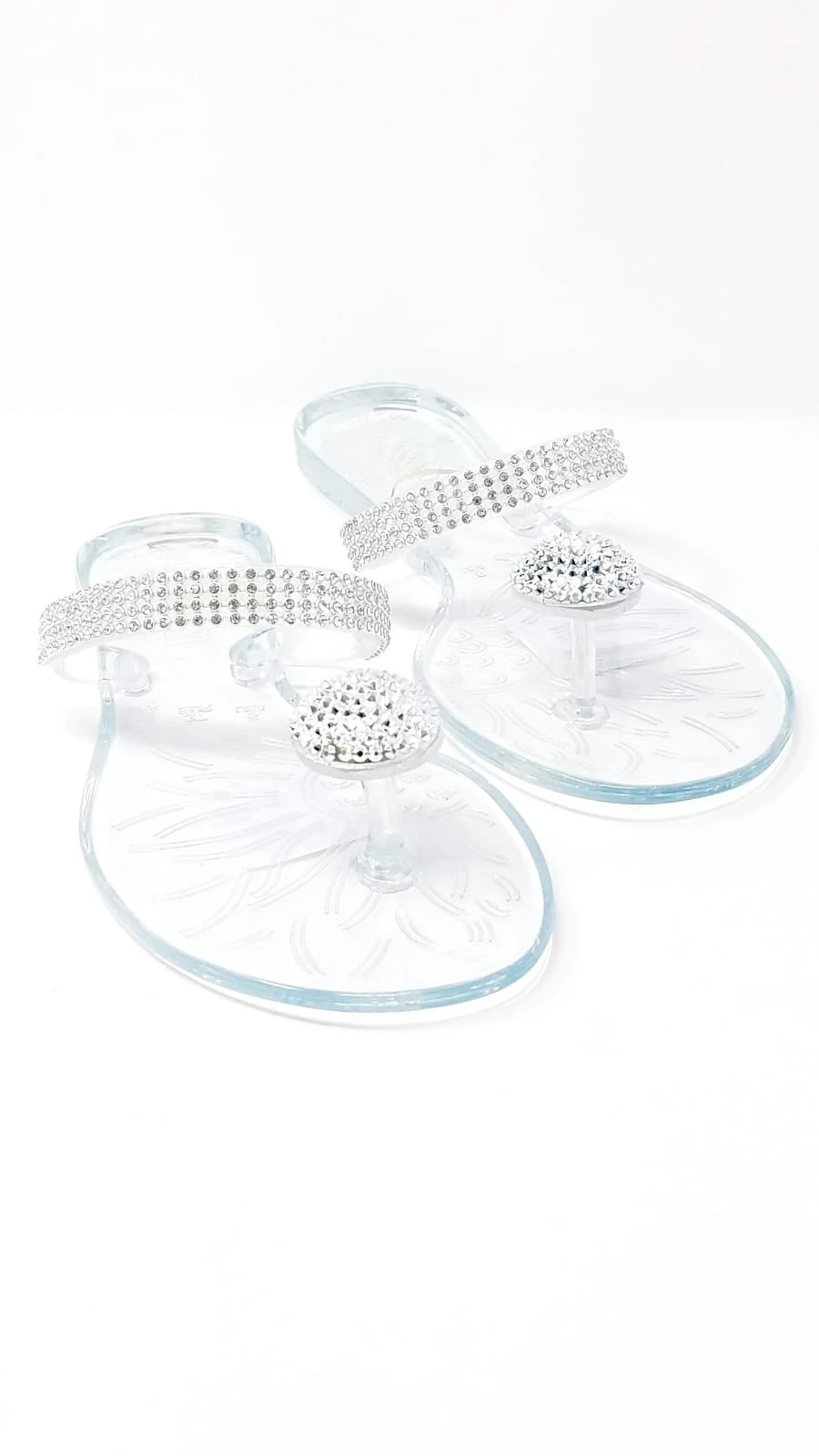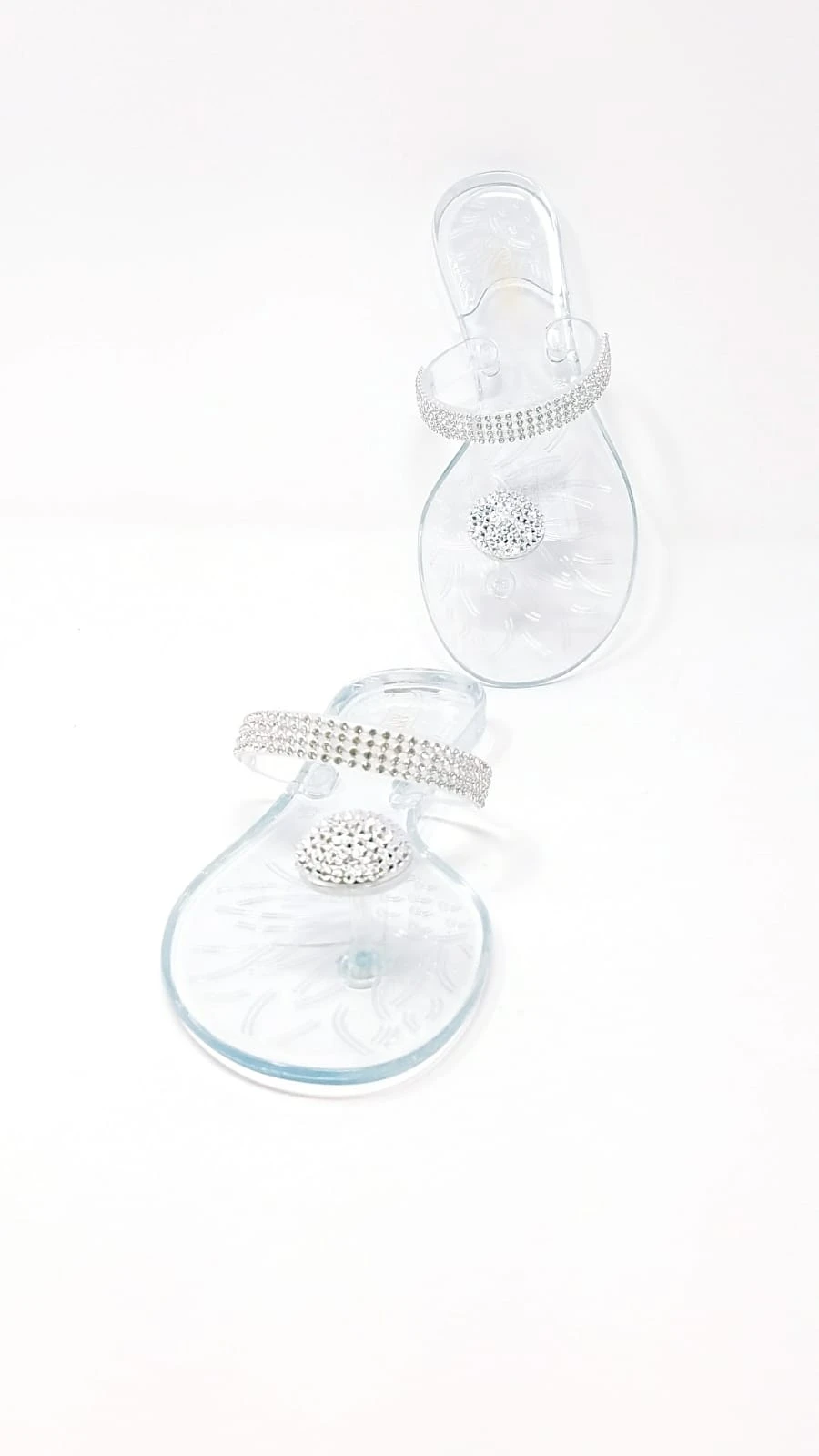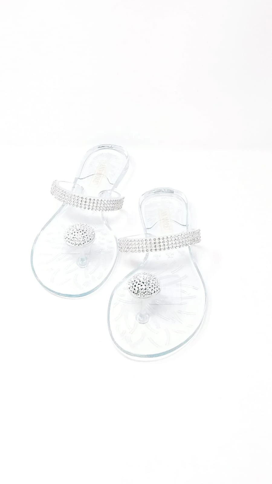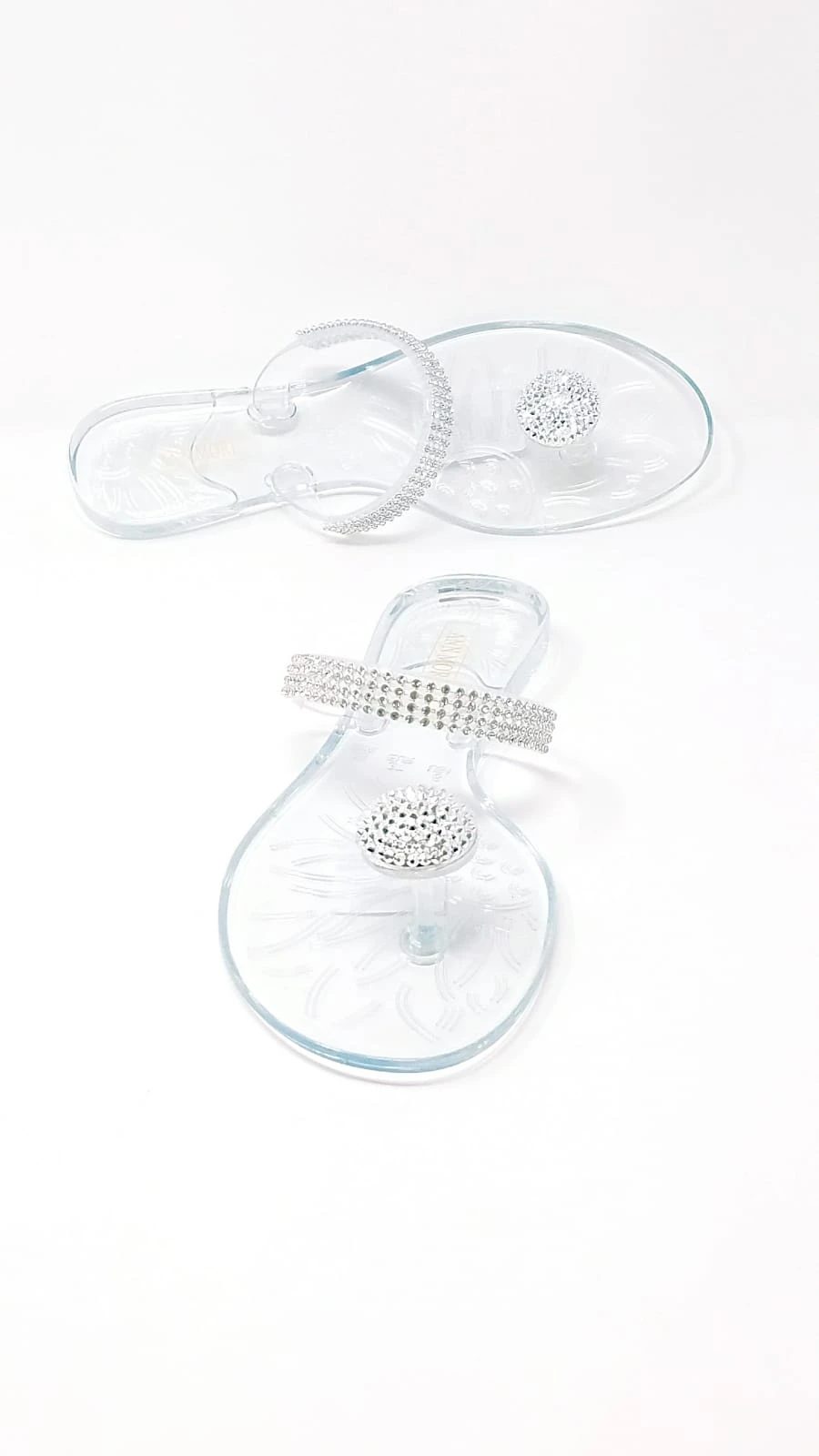 Have everyone’s eyes set on your bejeweled feet with these shining beauties. These clear jelly sandals feature rhinestone embellished single strap and a rhinestone-encrusted dome charm on the toe.